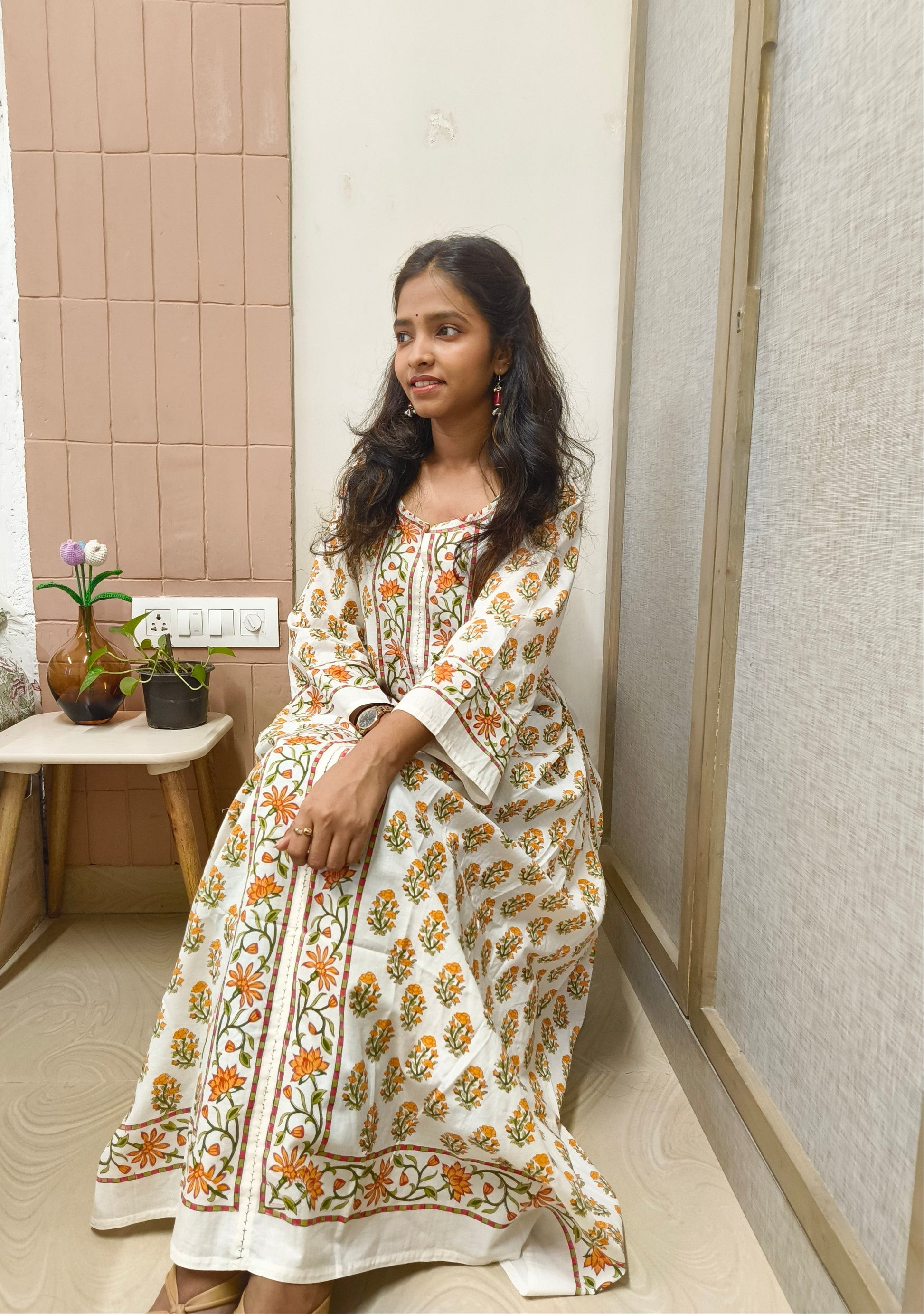 Elevate your ethnic wardrobe with our Handblock Cotton Bhopali-Style Long Kurta, designed for elegance, comfort, and grace. Made from breathable 60x60 soft cotton, this full-length kurta features intricate handblock printing, showcasing timeless Indian artistry. The Bhopali-style flare and back tie-knot add fluid movement and a customizable fit, making it ideal for tall women who love flowy silhouettes. Finished with delicate hand-stitched detailing along the neckline and front panel, each piece carries a handcrafted charm. Whether worn casually or for intimate festive gatherings, this kurta blends traditional style with everyday wearability.